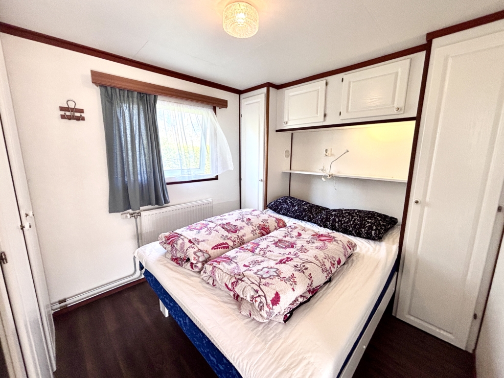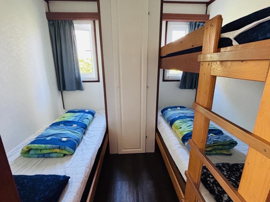 Es gibt zwei Schlafzimmer, eines mit einem Doppelbett (Matratze 140 x 200 cm) und viel Stauraum sowie ein Schlafzimmer mit einem Etagenbett und einem Einzelbett. Einzelbettdecken sind vorhanden.