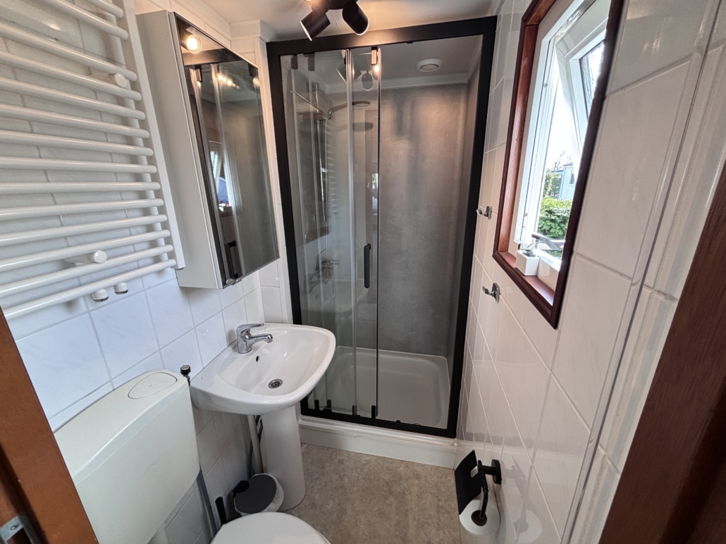 Das Badezimmer ist funktional eingerichtet und verfügt über ein Waschbecken mit Spiegel, eine geräumige, durch eine Glastür abgeschlossene Duschkabine und natürlich eine eigene Toilette.